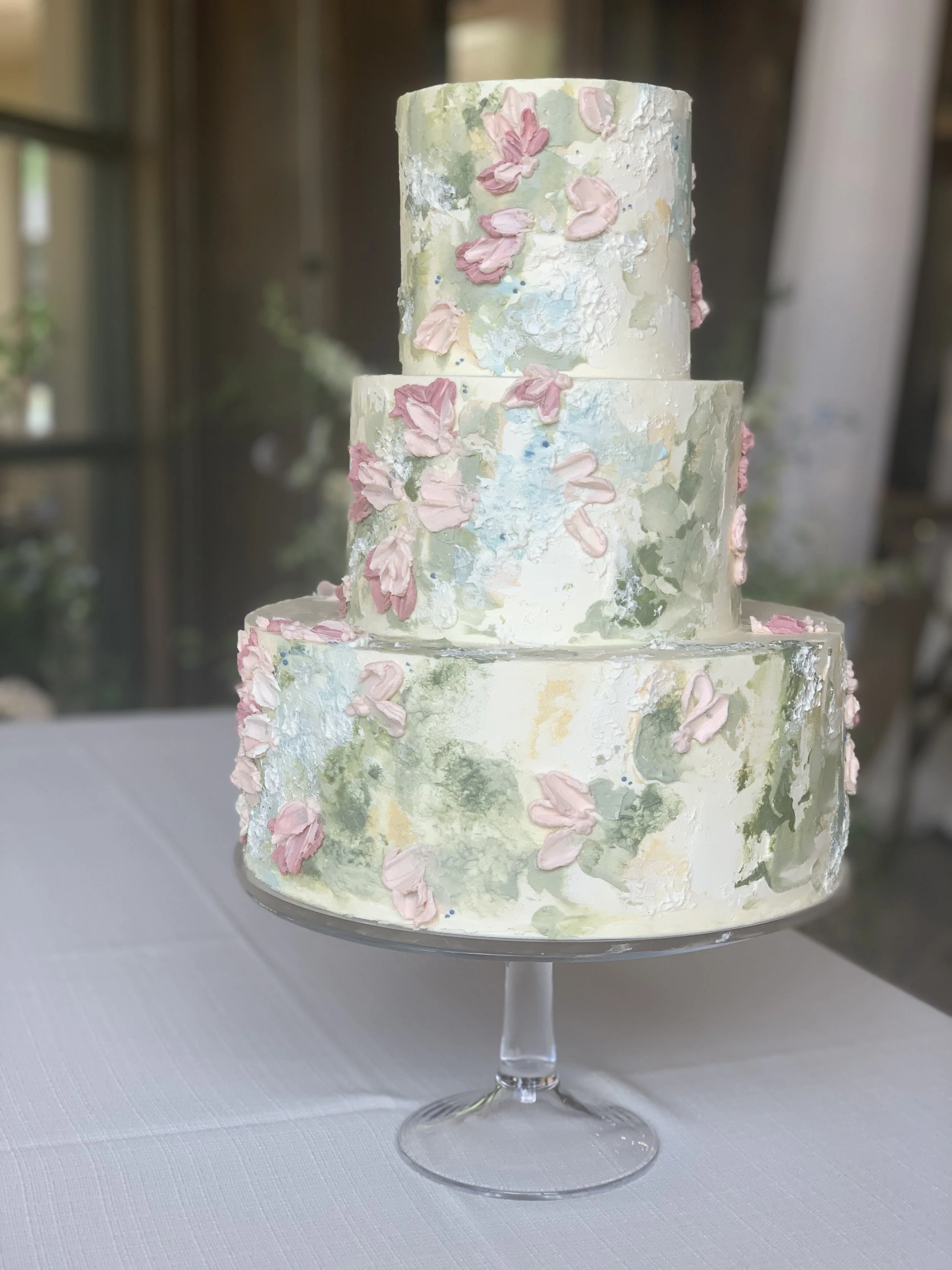 Elegant three-tier white wedding cake adorned with pastel pink, white, blue, and yellow flowers, displayed on a wooden cake stand.