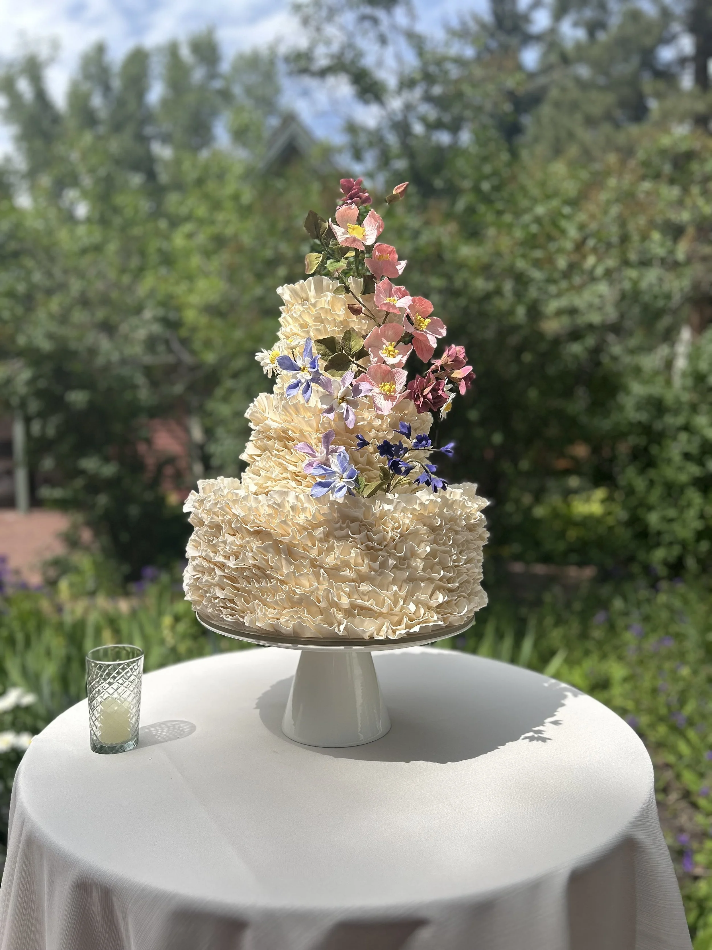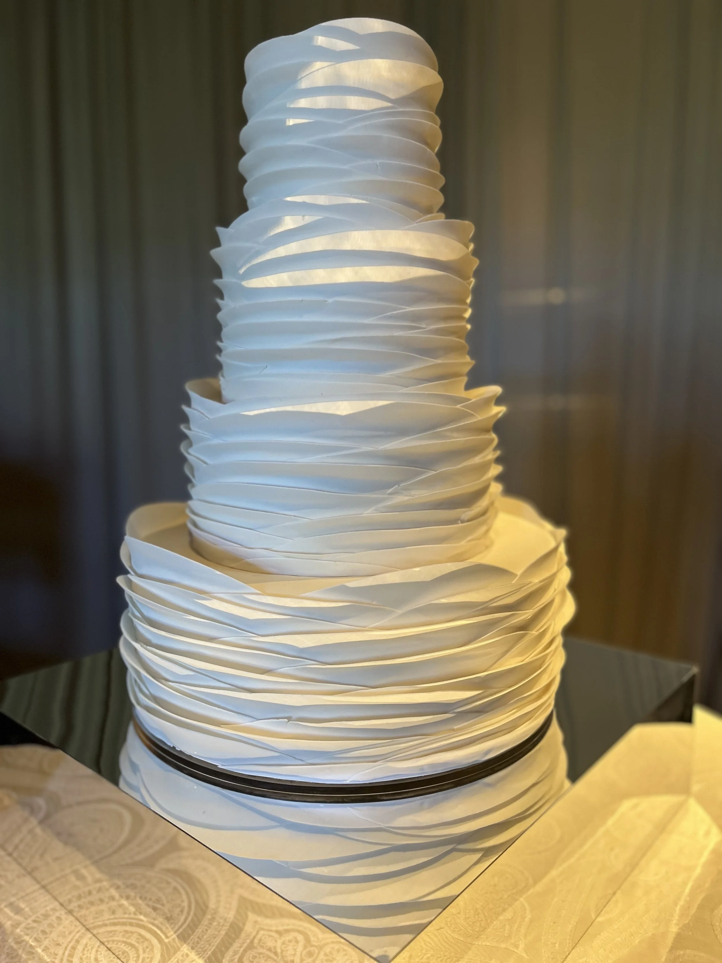 Elegant white wedding cake with cascading white buttercream decorations and small white leaves, set outdoors.