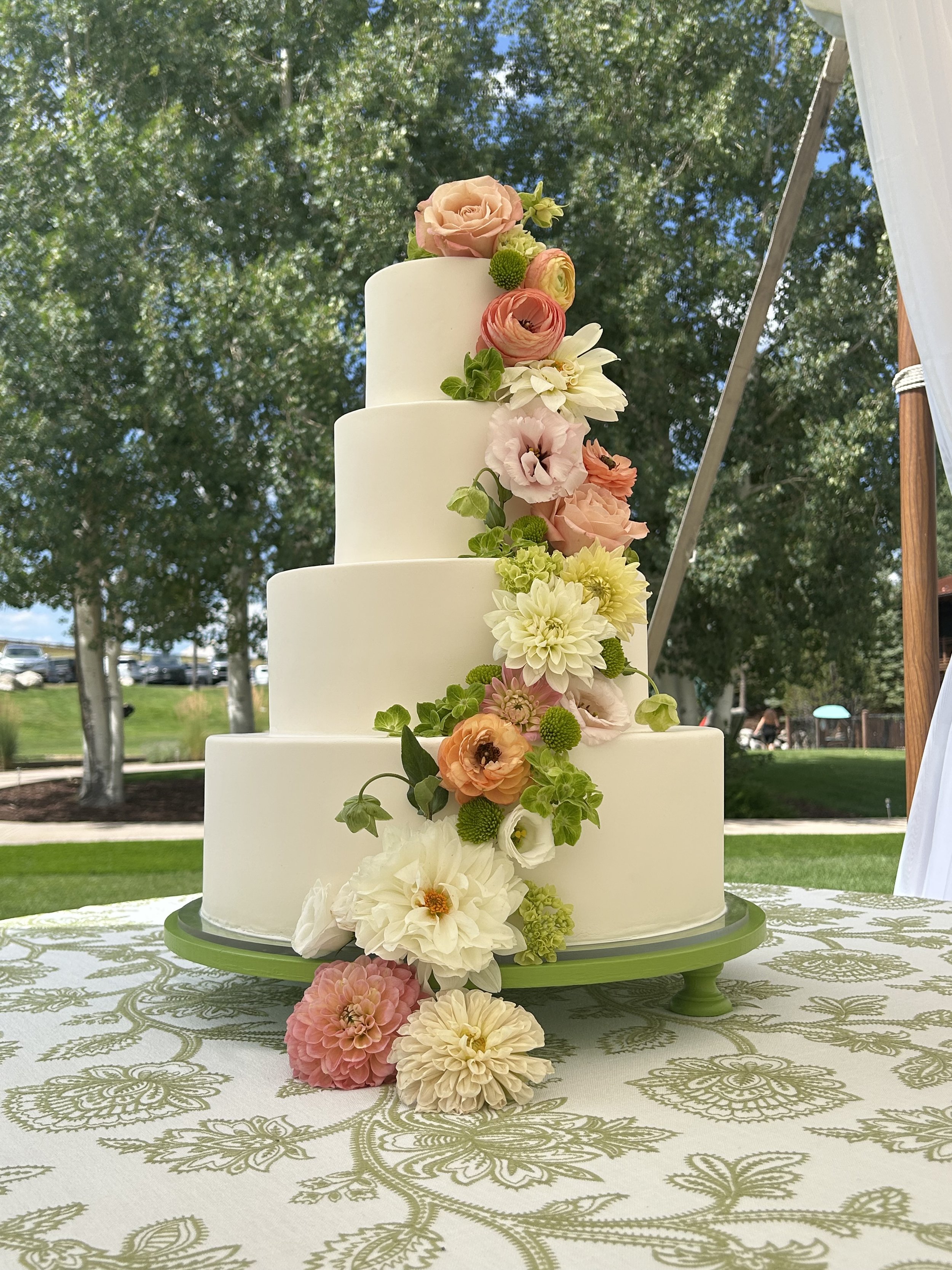 A multi-tiered wedding cake decorated with pink and white flowers and green leaves, surrounded by additional flowers on a table.