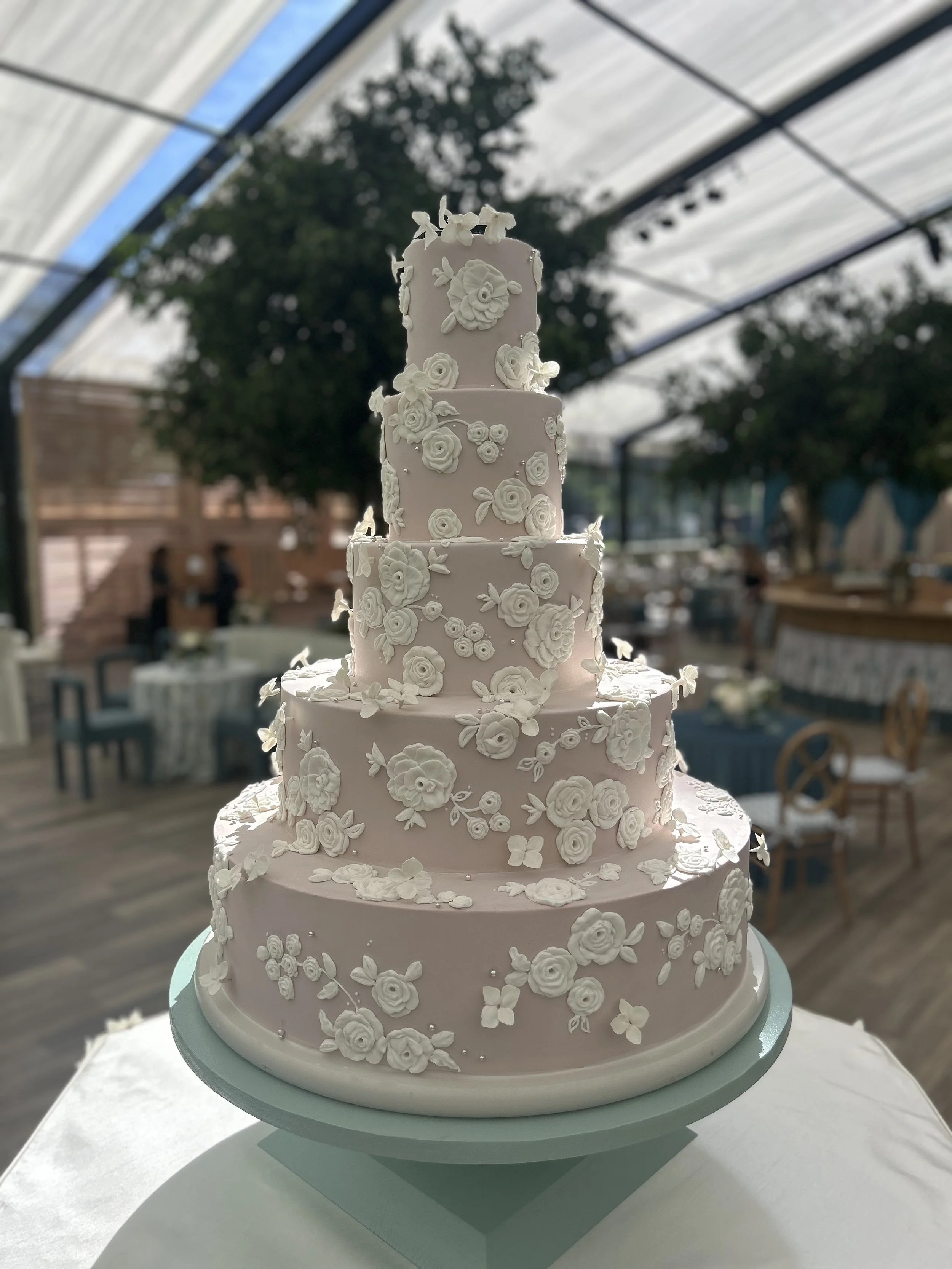 Tall multi-tier wedding cake decorated with white flowers and pink accents, displayed on a table in an elegant event venue.